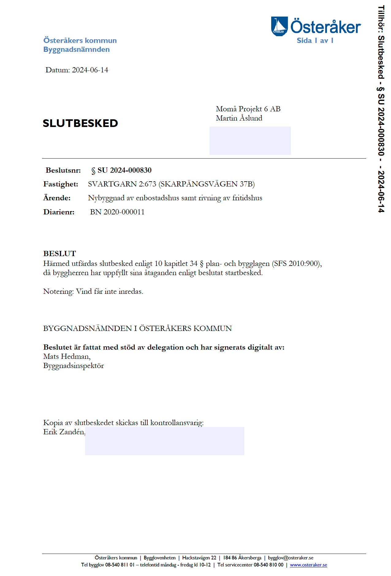 Som annan leverantör till MoMå AB i denna tvist återfinns Halldén Konsult AB. Det är även dom som har gjort slutbesiktningen av fastigheterna på BRF Svartgarn Kustvillorna och MoMå Projekt 6 AB. Det besiktningsföretag man anlitat innan hade aldrig ens avslutat besiktningen då det var så bristfälligt och mycket fel vid byggnationen. Slutbesiktningen sker någon gång den 28, 29:e eller 30 november 2022. Tillträde är 1:a december och kräver en godkänd slutbesiktning. Varför är vi då osäkra på när slutbesiktningen skedde? Jo för att det har även här skickats in dokumentation med olika information. Efterhandskonstruktioner.